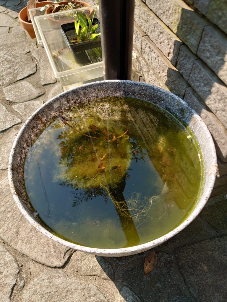 姫スイレンも入っているのですが、葉っぱだけ夏に茂って、花は咲いたことがありません。調べてみたら、日当たりが良いところじゃないと咲かないらしいので、日当たりの良い場所に移動してみました。今年は咲くといいな。